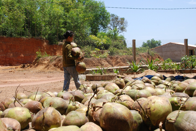Nông dân Dương Minh Trưởng (67 tuổi) ở thôn Tân An, xã Hoài Châu (Thị xã Hoài Nhơn), người hiện có 36 cây dừa ta trồng từ năm 1985 trên đất vườn thừa thẹo cho biết thêm: “Lúc cao điểm, dừa già lấy cơm chế biến dầu có giá 11.000 – 12.000đ/quả, hiện nay dừa quả to khoảng 1,5kg mới bán được 7.000đ/quả, dừa nhỏ hơn chỉ 6.000đ/quả. Thời điểm dừa tăng giá, mỗi đợt hái dừa gia đình tôi cũng có thu nhập 6 – 7 triệu đồng, lúc giá hạ thấp mỗi đợt thu hoạch với 36 cây dừa gia đình tôi cũng thu được vài triệu đồng”.